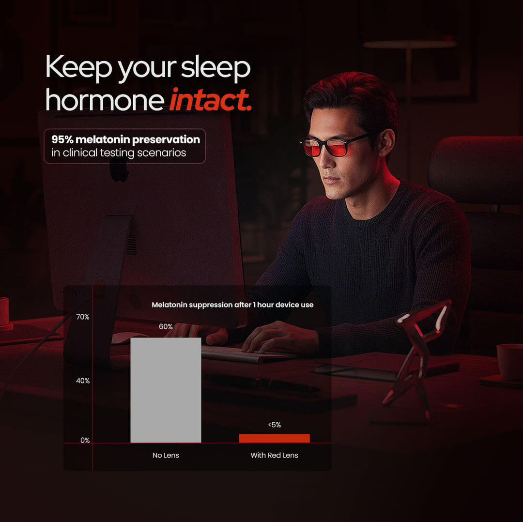 Red lenses block 99% of blue light so your brain unwinds naturally for deeper sleep.